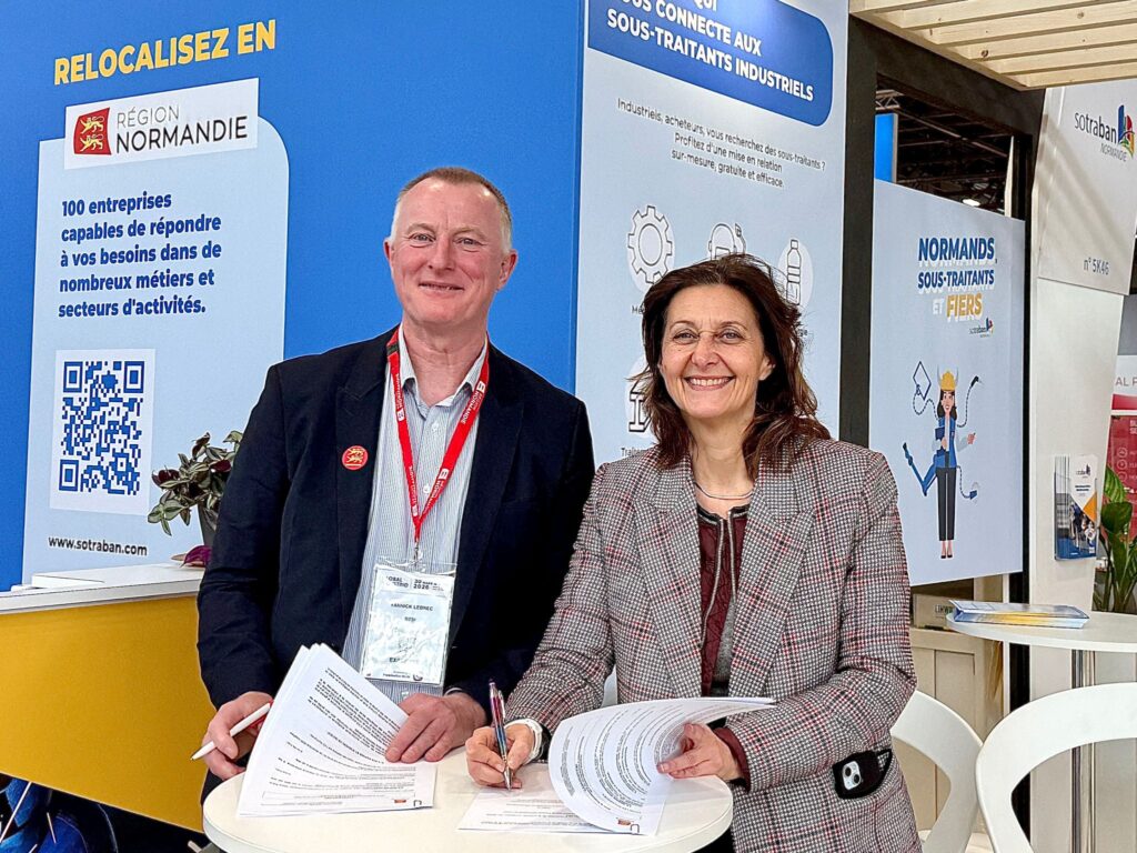 Lundi 30 mars : signature du contrat de filière de la sous-traitance entre la Région Normandie et SOTRABAN, en présence de Sophie Gaugain, Vice-présidente de la Région, sur le pavillon Normandie.